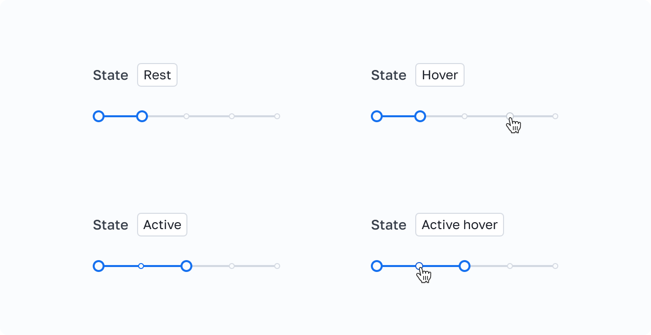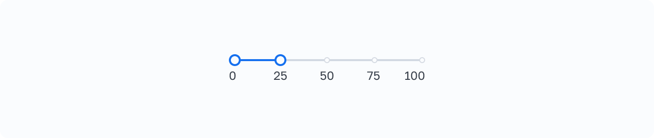 Slider и Range обычно представлены в виде горизонтальной шкалы с ползунком(ами), которые можно перемещать для выбора значений. Размер зависят от контекста интерфейса или конкретной задачи, позволяя адаптировать компонент под разные сценарии использования и обеспечивать удобство взаимодействия.